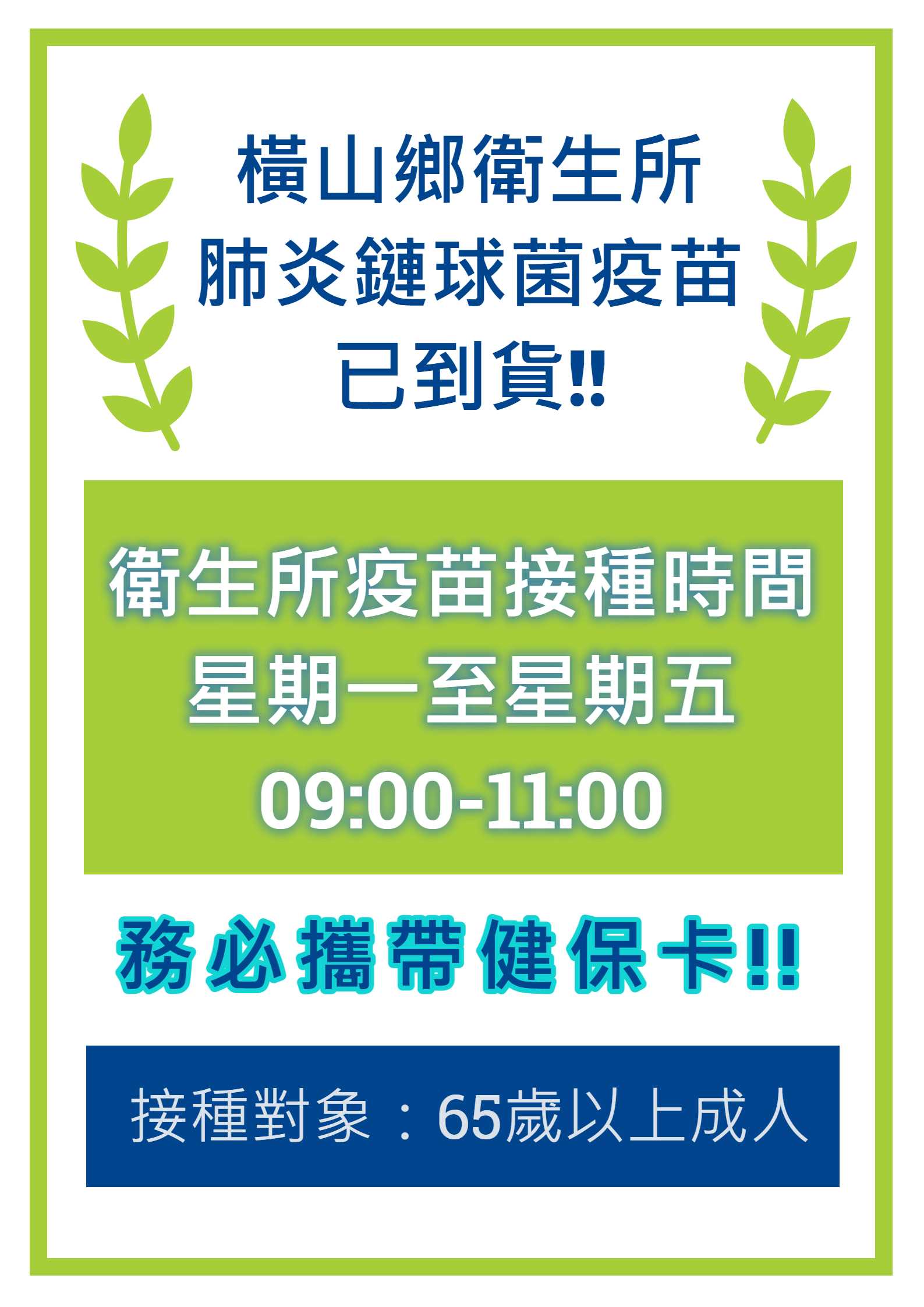 橫山鄉衛生所 肺炎鏈球菌疫苗 已到貨 衛生所疫苗接種時間: 星期一至星期五 09:00-11:00 接種對象:65歲以上成人 請務必攜帶健保卡!! ▁▂橫山鄉衛生所 關心您的健康▂▁