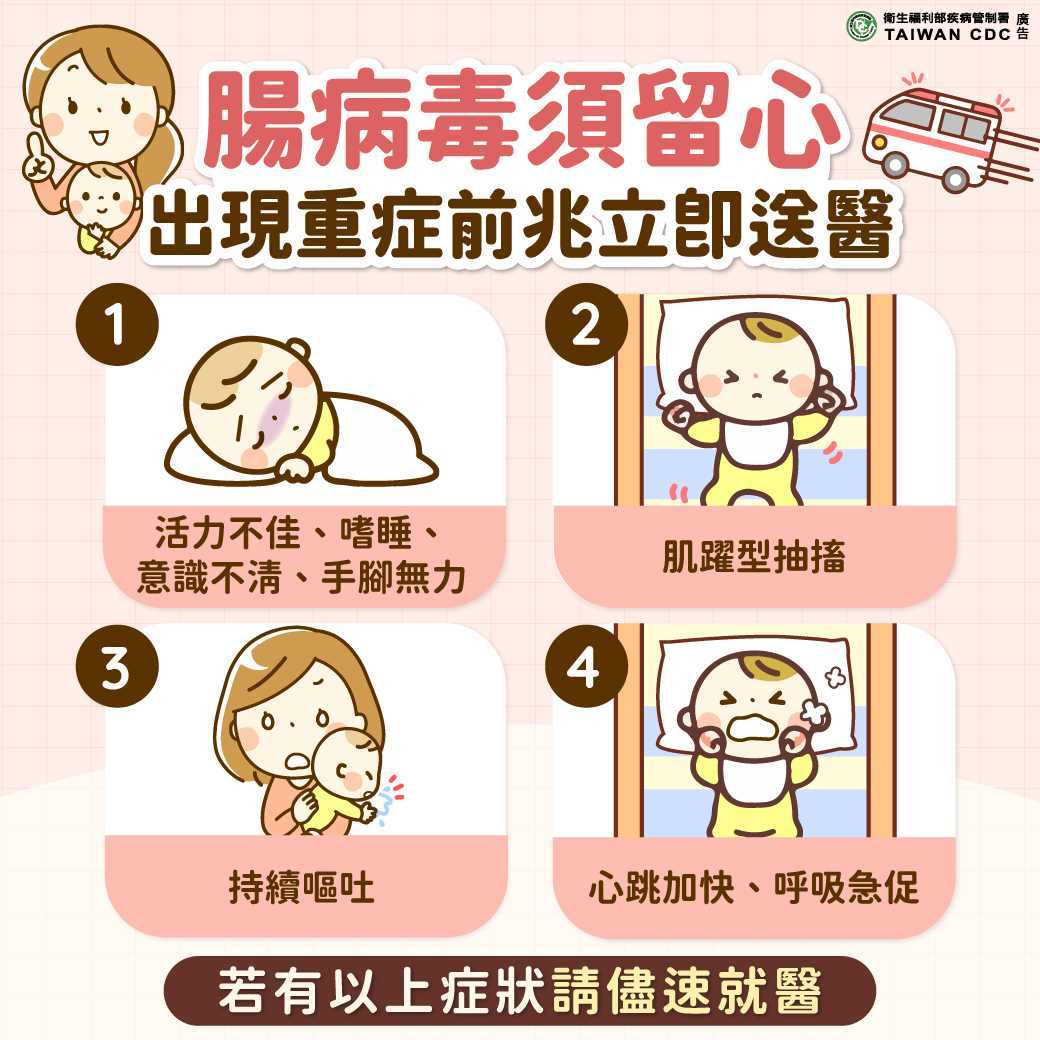 五歲以下嬰幼童為腸病毒重症高危險群,如經醫師診斷感染腸病毒,請留意嬰幼童健康狀況,如有嗜睡、意識不清、活力不佳、手腳無力或麻痺、肌抽躍(無故驚嚇或突然間全身肌肉收縮)、持續嘔吐與呼吸急促或心跳加快等腸病毒重症前兆病徵,請儘速送到大醫院接受治療。