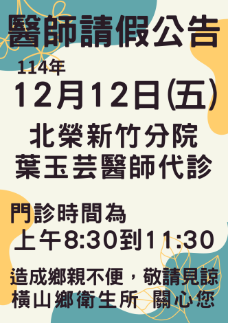 橫山鄉衛生所醫師114年12月12日醫師請假代診公告