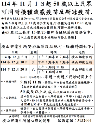 橫山鄉衛生所114年12月公費流感疫苗、新冠疫苗及肺炎鏈球菌疫苗施打時程表