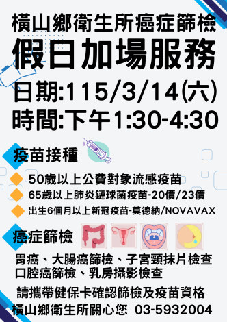 橫山鄉衛生所115年3月公費流感疫苗、新冠疫苗及肺炎鏈球菌疫苗施打時程表